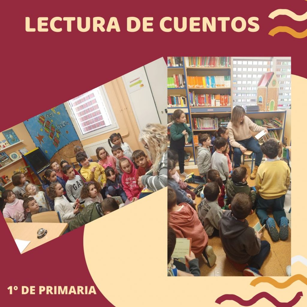 La clase de 1°B, ha recibido la visita de las mamás » cuentacuentos» para realizar una actividad de animación lectora en la Biblioteca del centro.