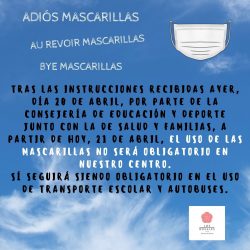 Desde el pasado 20 de abril, las mascarillas han dejado de ser obligatorias en interiores. Tras recibir instrucciones al respecto nuestro alumnado no está obligado a usarlas en el aula.