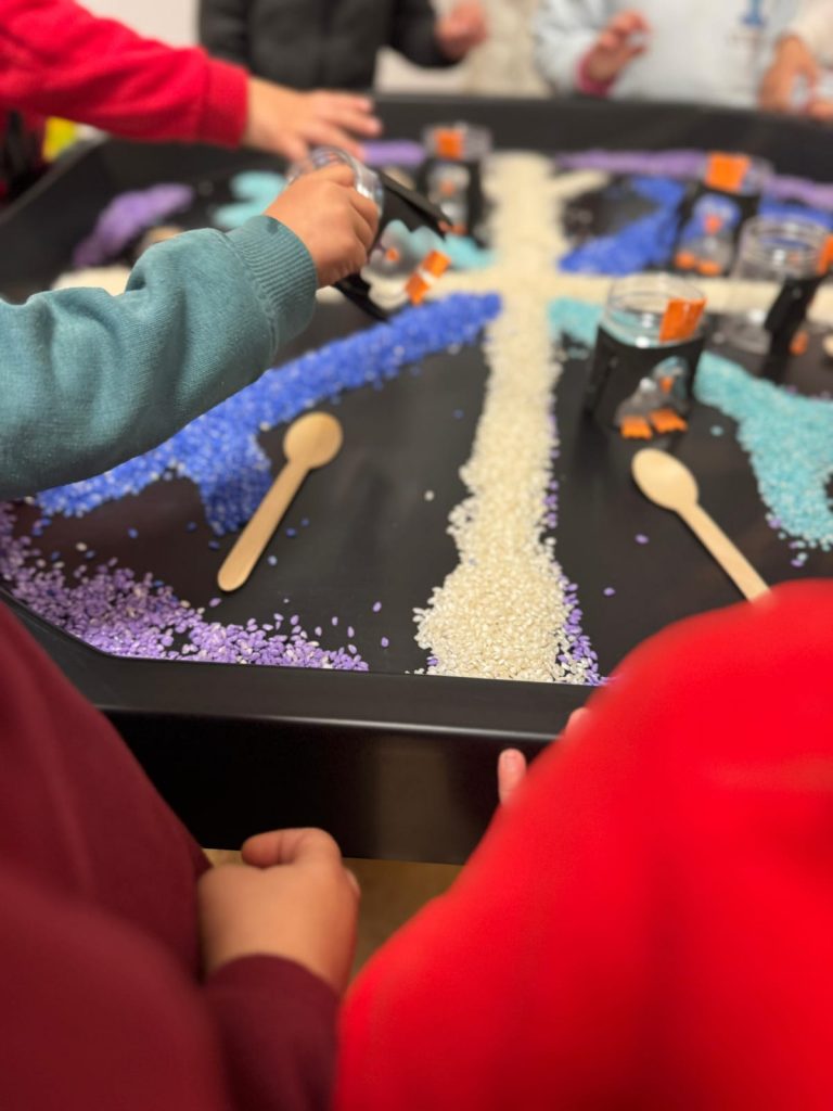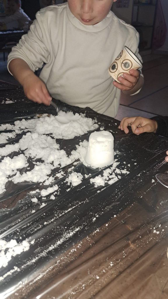 En la clase de 3 años de educación infantil estamos acercando a los niños y niñas al método científico a través de experimentos como este. Nieve artificial que la obtenemos con la mezcla de agua y bicarbonato.