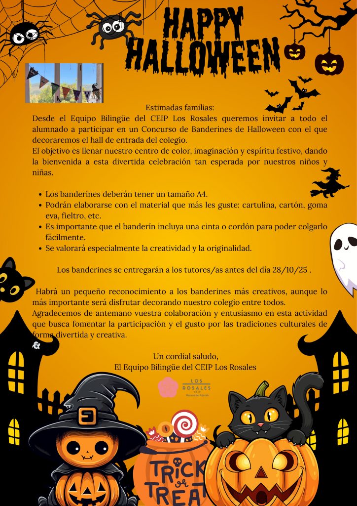 Estimadas familias, ya se acerca Halloween y el Equipo Bilingüe de nuestro centro nos propone una nueva actividad: concurso de banderines. A continuación podréis ver el comunicado . Happy Halloween!