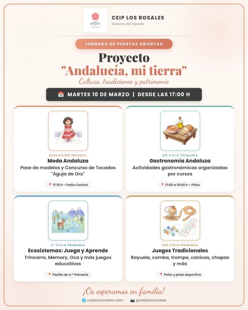 Nos complace invitarles a la Jornada de Puertas Abiertas que celebraremos la tarde del próximo martes 10 de marzo en nuestro centro, en el marco del proyecto “Andalucía, mi tierra”, en el que el alumnado ha estado trabajando durante estas semanas.